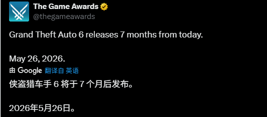 火爆新消息知名全球系列游戏《侠盗猎车手6(GTA6)》消息公布在2026年5月26号上线发售,TGA官方在社交媒体公布消息提醒各位玩家